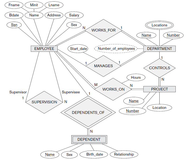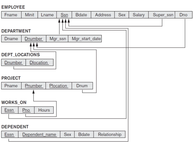 - WORKS_FOR (DEPARTMENT-EMPLOYEE) : EMPLOYEE가 N에 해당하는 Entity type임 -> DEPARTMENT의 PK -> EMPLOYEE의 FK (Dnumber -> Dno)