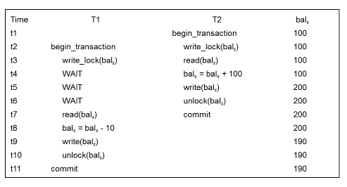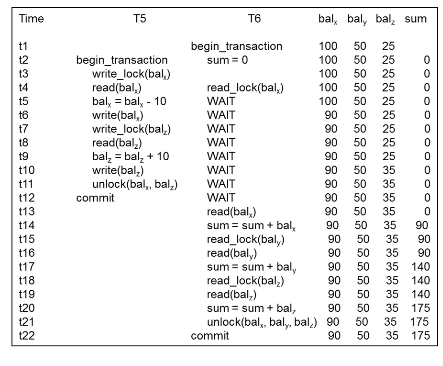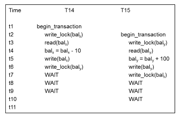 T14는 balx에 대한 write_lock을 가진 상태에서 baly에 대한 write_lock을 요청 -> T15가 가지고 있으므로 대기