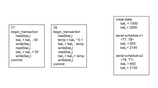 -> 주의 : Serial Schedule은 순서에 따라 항상 같은 결과가 나오지 않음 ex) Concurrent Transaction T1, T2, T3가 있을 때 <T1, T2, T3>와 <T3, T2, T1>의 결과가 다를 수 있음. -> 그러나 어떠한 결과가 나오더라도 serial schedule은 correct한 것으로 간주함.