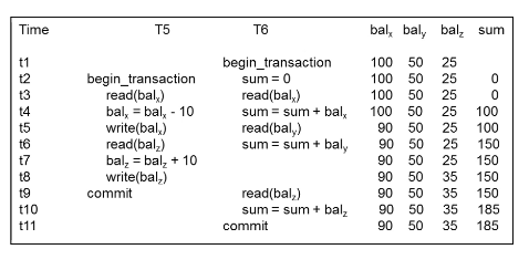 T5는 balx에서 balz로 10을 이체하고 싶고 T6은 balx, baly, balz를 합친 결과를 얻고 싶음. -> 원하는 T6의 결과 : 175가 되어야 함.