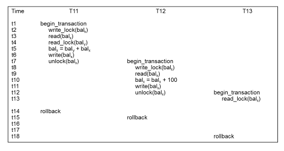 2PL을 모두 따르고 있더라도 맨 처음 Lock을 건 transaction이 rollback을 하면 그 이후에 실행된 모든 transaction도 rollback을 해줘야 함. (T11이후에 일어난 T12, T13은 T11에서 수정한 값에 종속적이 되므로)