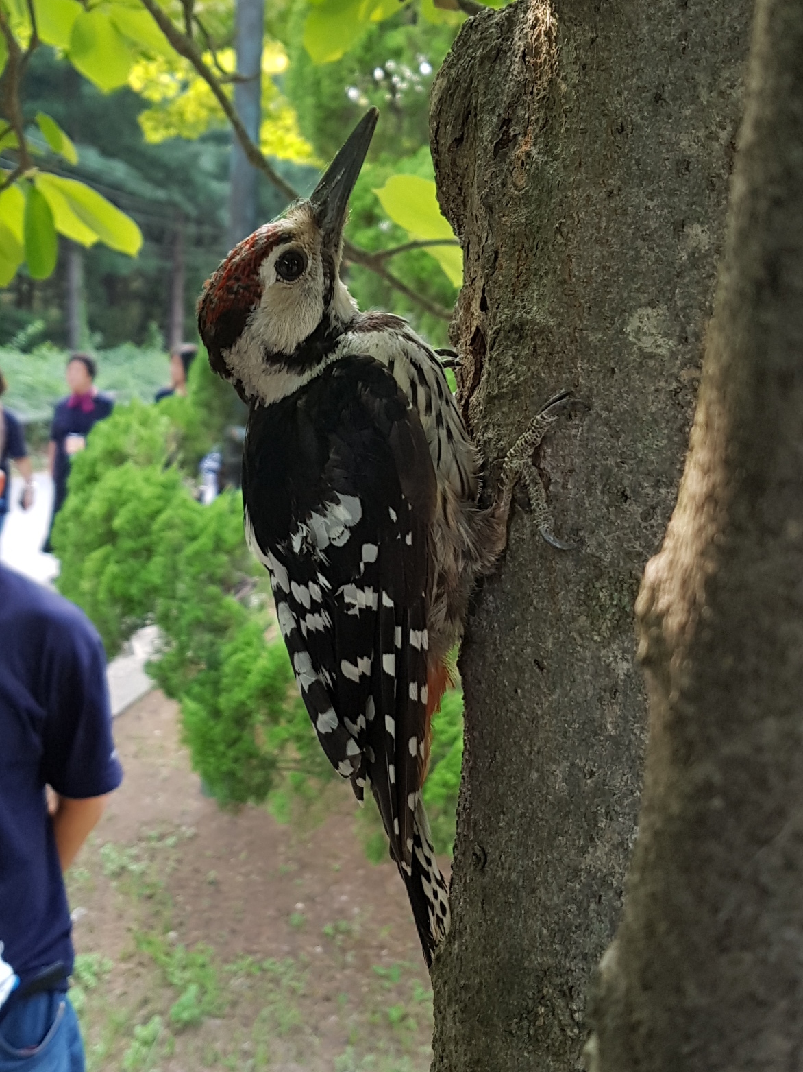 오색딱다구리 : 배쪽은 흰 색을 띤다. 어깨에 V자 모양의 큰 반점이 있으며 허리는 검은색이다. 수컷의 경우 정수리 뒤쪽에 붉은색이 좁게 나타난다. 도심 공원을 비롯하여 숲이나 산에 널리 분포하며 자주 보인다.